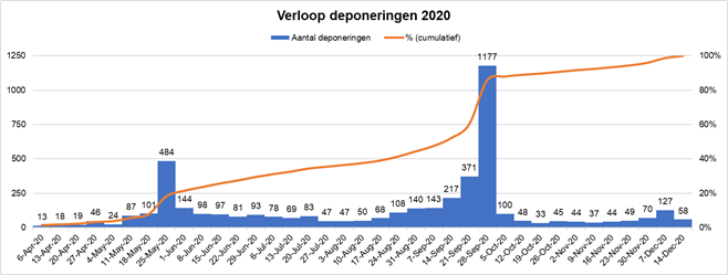 Normaalgesproken is de deadline voor het inleveren van de jaarrekening over het voorgaande boekjaar 31 mei, maar net als in 2020 hebben de aanbieders in verband met corona 4 maanden uitstel gekregen van het ministerie van VWS. Het is echter niet aannemelijk dat alle zorgaanbieders van de extra tijd gebruik zullen maken. De onderstaande visual toont op welk moment in het jaar de zorgaanbieders in 2020 de jaarrekening (boekjaar 2019) hebben gedeponeerd.